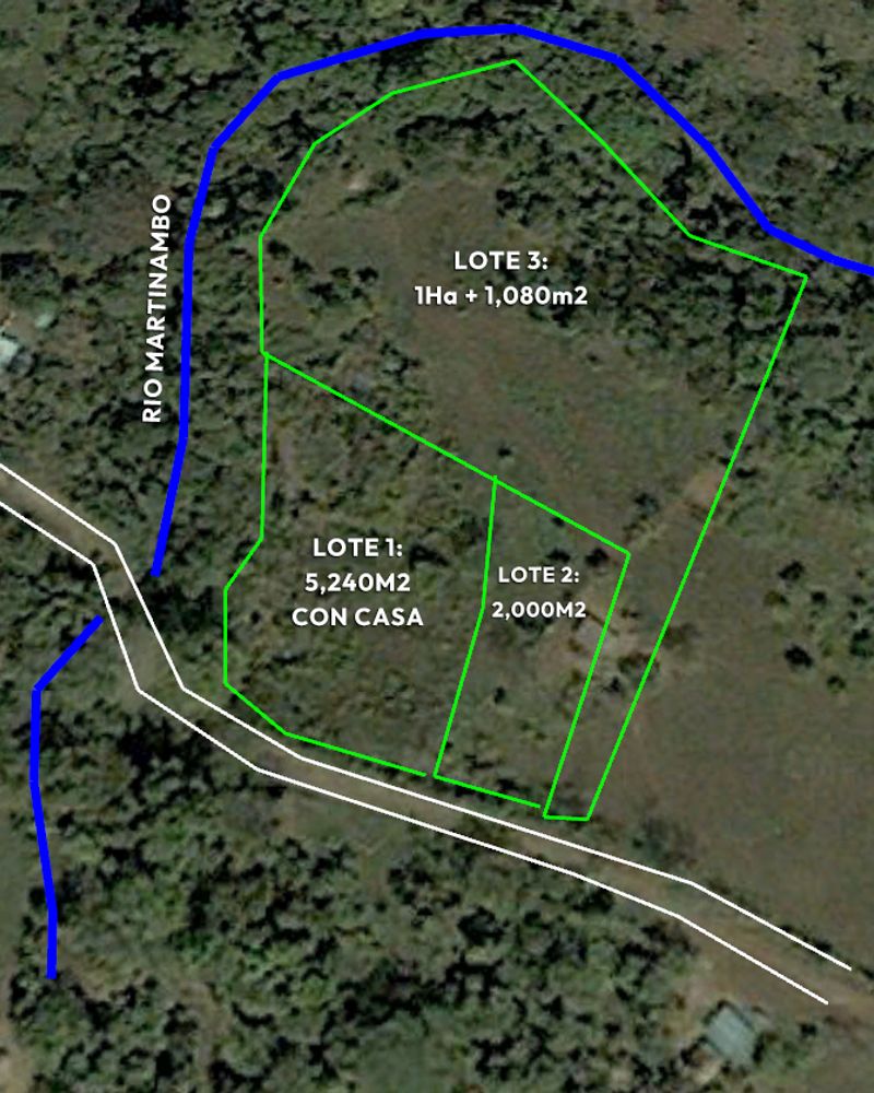 Esta finca cuenta con una casa de 70m2, deposito y galera. Esta situada a orilla de la calle principal que conduce desde Puerto Coquira a Chinina. Por la parte trasera del terreno colinda con el Rio Martinambo. Cuenta con arboles frutales como Toronja, Naranja, Limon, Aguacate y también tiene siembros como yucca y Plátano. El Terreno cuenta con titulo de propiedad